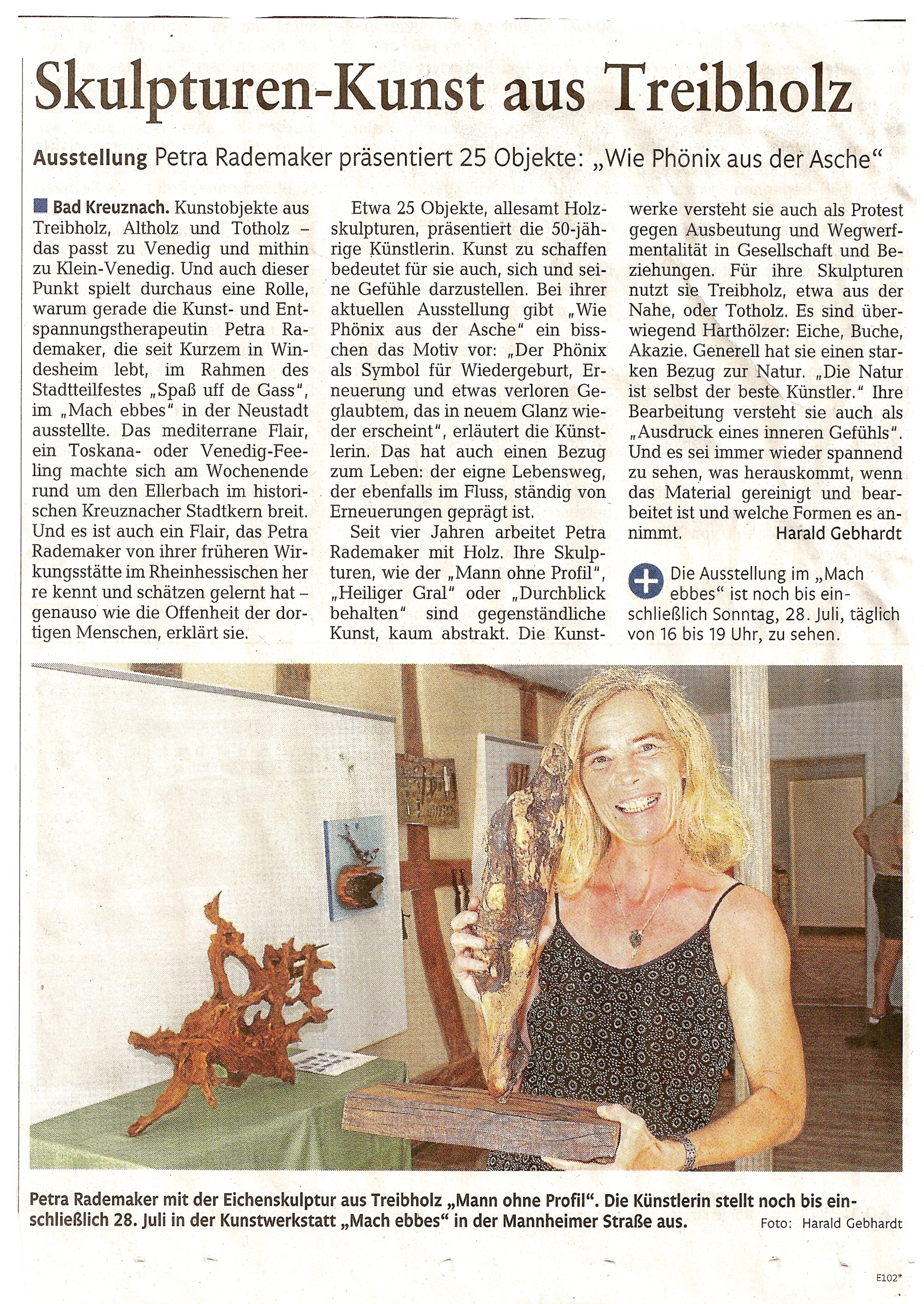 Die Kunsttherapeutin und Künstlerin Petra Rademaker aus Windesheim zeigt in ihrem noch fertig zu stellenden neuen Wohnsitz mit Atelier, in der alten Schreinerei Kirchstr. 40, Bad Kreuznach Winzenheim